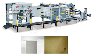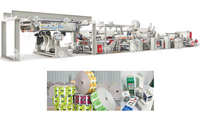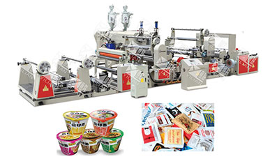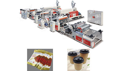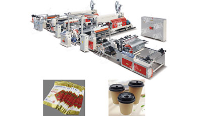 復合淋膜機 整機由加料裝置、擠出機主機、模具、放卷機構、復合機構、收卷機構、邊位控制裝置、切邊裝置、加熱冷卻系統、電氣測控系統等部分組成。根據不同制品需要可添加第二放卷機構、印刷設備、烘箱、基材表面處理裝置、在線測厚儀等組成部分。