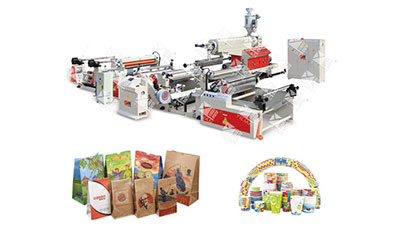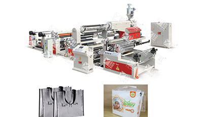 淋膜機 整機由加料裝置、擠出機主機、模具、放卷機構、復合機構、收卷機構、邊位控制裝置、切邊裝置、加熱冷卻系統、電氣測控系統等部分組成。根據不同制品需要可添加第二放卷機構、印刷設備、烘箱、基材表面處理裝置(電暈機等)、在線測厚儀等組成部分。
