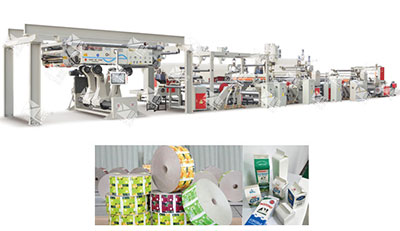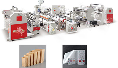 整機由加料裝置、擠出機主機、模具、放卷機構、復合機構、收卷機構、邊位控制裝置、切邊裝置、加熱冷卻系統、電氣測控系統等部分組成。根據不同制品需要可添加第二放卷機構、印刷設備、烘箱、基材表面處理裝置(電暈機等)、在線測厚儀等組成部分。 前道工序設備:造粒機,印刷機或其他設備;后道工序